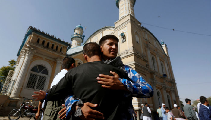 Afghans greet each other outside the Shah-e Doh Shamshira Mosque, on the first day of Eid-ul-Fitr. Photo: REUTERS