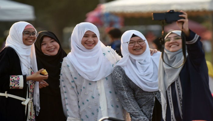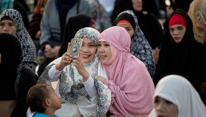Muslim women take pictures of themselves before Eid-ul-Fitr prayers at the Quirino Grandstand in Manila on June 25, 2017. Photo: AFP