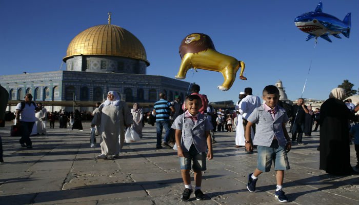 Palestinian boys hold balloons as Muslims gather for the morning Eid-ul-Fitr prayer near the Dome of Rock at the Al-Aqsa Mosque compound in the Old City of Jerusalem. Photo: AFP
