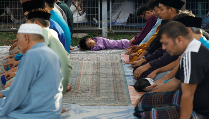 A boy looks on amongst Muslims praying during Eid-ul-Fitr prayers, marking the end of the holy fasting month of Ramazan in Singapore. Photo: REUTERS