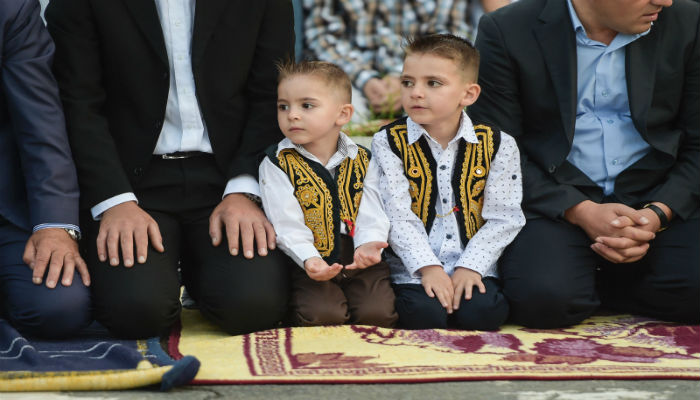 Young Kosovo Muslims attend the Eid-ul-Fitr prayer near the Sulltan Mehmet Fatih mosque in Pristina on June 25, 2017. Photo: AFP