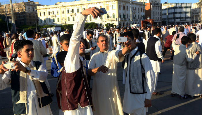 Libyan men take photos as Muslim worshippers gather at the Martyrs´ Square in the capital Tripoli to perform Eid-ul-Fitr prayers on June 25, 2017 to mark the end of the fasting month of Ramazan. Photo: AFP